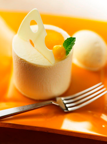 hanareの宮澤パティシエールが、「第11回kiriクリームチーズコンクール」で入賞を果たしたプチガトー。「kiriチーズを夏でもおいしく味わってほしい」という想いで、ミルキーな味わいのkiriチーズのムースに、エネルギッシュで濃厚な甘みを持つマンゴーのジュレを合わせました。さらにムースの中には、オレンジ果汁で炊いたにんじんのコンポートをしのばせ、シャキッとした食感とともにフルーツでは出せない穏やかな甘さをプラス。ムースの中にスフレチーズの層を作り、チーズのコクをアップさせているのもポイントです。まったりとしたクリームチーズを涼やかにまとめあげた味わいに、大人も子どもも思わず笑顔になるようにと、フランス語で"えくぼ"を意味する「Fosette」と名付けました。