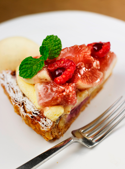 小山シェフの大好物でもある秋の味覚・いちじくの魅力を存分に味わっていただくためのタルト。毎日仕入れる、その日の一番おいしい国産いちじくを、タルト台からこぼれ落ちんばかりにトッピングしました。フランボワーズをあしらいフルーティーな酸味を加えたダマンドと、いちじくのぐっと熟した甘みをまろやかにしてくれるカスタードクリームも名脇役。サクッと焼けた外側のブリゼ生地と、かすかに種のプチプチ感が残るいちじくの食感とのハーモニーも絶妙です。