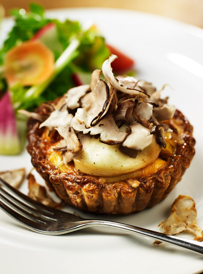こんもりと盛られて存在感たっぷり!幾重にも重なり合い、心地よい歯ごたえを奏でるこちらは、岡山県美作の「ムサシ農園」で丁寧に栽培された原木椎茸のスライス。火入れはほんの数分、味付けはオリーブオイルと塩のみにとどめ、自然の恵みをたっぷり吸収した原木椎茸ならではの、格別な香りと旨みを最大限に引き出しました。キッシュの中にも、大きめにカットした肉厚の椎茸をたっぷりと入れているので、噛むたびにじんわりと旨みと香りが広がっていきます。もう一つの主役は、今が旬の「インカのひとみ」。サツマイモや栗かぼちゃを思わせるほっくり甘いじゃがいもで、旨みたっぷりの椎茸とは相性抜群です。そんな季節の素材を優しくカバーするように、日向牧場のカチョカバロをぽってりとのせて、ミルクの甘味がぎゅっと詰まった濃厚な風味とスモーキーな香りをプラスしました。さらに、バター醤油でソテーしたえのきの香りと食感がさりげないアクセントに。「その香りも味わいもたまらなく好き」という、椎茸好きの小山シェフも一押しのひと品です。