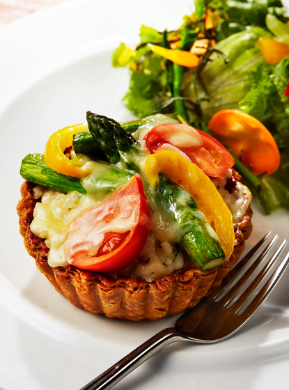 フレッシュな香りが広がる夏野菜と、絶妙な加減で火入れしたほどよい食感と爽やかさをまとった青じそチーズリゾットが絡み合う、夏のキッシュが登場しました。ボトムに敷いた玉葱とベーコンの上からクリーミーなアパレイユをたっぷりと流し込んだサクサクのブリゼ生地に、軽く芯を残してアルデンテに仕上げた青じそのリゾットと夏野菜をふんだんに盛りつけて、彩り豊かに焼き上げました。ソテーして甘みを増した旬のアスパラガスと彩り鮮やかなパプリカ、フルーツトマトのほどよい甘味と酸味が、お口の中で爽やかな青じそリゾット、チーズやベーコンなど塩みの効いた素材とバランスよく絡み合います。リゾットに混ぜ込んだ“青じそ”の爽やかさ、刻んだ新玉葱の甘み、そして、ほのかに香るフルーティな白ワインが、軽やかにハーモニーを奏でます。夏の美味を新感覚で楽しめる“リゾットキッシュ”を、ぜひお楽しみください。