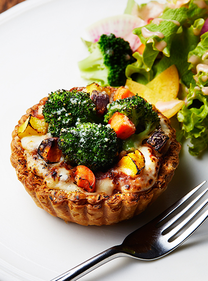 温かみを感じる色鮮やかなキッシュの主役は、京丹後市で土づくりからこだわり有機栽培でたくさんのお野菜を育てられているSORA農園さんから届いたオレンジ、イエロー、パープルの「カラフル人参」。この3種の人参は、火入れによって適度な歯ごたえを感じる食感に仕上げ、やさしい甘味を引き出しました。人参の色合いとのバランスが目にも心地よいブロッコリーは短時間で茹でて、仕上げにゲランド塩をほんの少しのせて。センターには一からレシピを作った「自家製のミートソース」を。適度に水分を飛ばしてトマトの酸味や肉の旨味をギュッと凝縮させました。この味わいが全体の味をまとめる名わき役に。ボトムには、丹波市で土の中で起こる自然の営みを最大限に活かした自然栽培を行う「うむ農園」さんの「自然栽培六条大麦」を敷き詰め、食感のアクセントとボリューム感を持たせました。エスコヤマのキッシュに欠かせないベーコンやチーズ、タマネギなどが塩味や旨味を下支え。仕上げにバーナーで火入れすることで加わる芳ばしさは、嗅覚からも美味しさを感じさせるためのひと工夫。季節の素材を生かしたキッシュをお楽しみください。