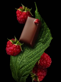 フランボワーズの酸味と華やかな香りをストレートに活かしたガナッシュを下層に置き、上層には、フランボワーズの葉を生クリームにアンフュゼしたカカオ分40%のショコラ・オレのガナッシュを配してほのかに青さを感じる香りと少しの苦味を活かしました。果実だけでは表現できないフランボワーズという植物の“深み”を余すところなく表現しています。