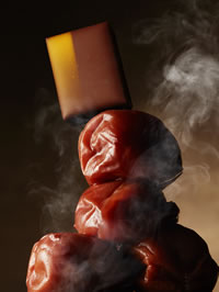 和歌山県産の南高梅の梅干しをみりん等で深みのある甘酸っぱい味わいに仕立てた後、28度の低温を保ちながら約16時間をかけて桜の樹のチップで燻したものをカカオ分40%のショコラ・オレと合わせてガナッシュに。ひと口含めばスモーキーな燻製香が鼻孔へ抜け、ガナッシュのなめらかな口どけと共に、ショコラ・オレのやさしい甘味と梅干し特有のパンチの効いた酸味が交わったやわらかなマリアージュが口の中で広がります。