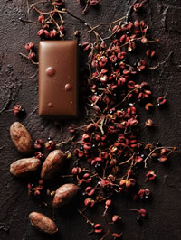 和歌山県産の完熟して真っ赤になった山椒を、実が落ちて傷つかないように手前の枝の部分から手摘みし、完熟の実と香りのオイルを含む枝ごと生クリームにアンフュゼし、そのマイルドな刺激と香りを移し取り、ペルー・チャンチャマイヨ産カカオのショコラ・オレ48%と合わせてガナッシュにしました。完熟の山椒ならではのマイルドな刺激と香りが、華やかな香りとドライプラムのような酸味を持つチャンチャマイヨのポテンシャルによって存分に引き出された。