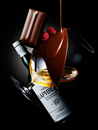 シェフ小山もウィスキーの中ではそのパンチの効いたスモーキーさが好き、というアイラモルトのウィスキー「ラフロイグ10年」と、華やかでフルーティーな酸味を持つフランボワーズとのマリアージュ。下層は、ベリー系と相性の良いマダガスカル産カカオとフランボワーズを合わせたガナッシュ。上層は花のような香りを持ち、スモーキーな香りと相性の良い、植物のようなニュアンスを持つエクアドル産アリバ・ナシオナル種カカオのショコラ・オレ50%とウィスキーを合わせたガナッシュを配し、これらを2層にして重ね、マリアージュを表現しました。わずかに口どけの早いウィスキーのガナッシュから香るスモーキーさと独特の味わいが時間差でフランボワーズと出会うことで、後半から立ち上る心地よいカカオならではの余韻をお楽しみいただけます。