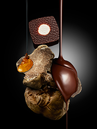 2012年、イタリアに旅した時に出会った白トリュフを漬けたハチミツ。パンチの効いたハチミツの個性ある甘さと香りに、ふわりと漂う白トリュフの豊かな香りを、エクアドル産カカオのショコラ・ノワール(カカオ分70%)に閉じ込めました。ハチミツはショコラに少し遅れて味蕾に届くので、まずはレーズンのような酸味が漂い、次に白トリュフの香りがパッと広がってすぐに消える。その後、ハチミツの香りがじんわり広がり、もう一度トリュフの香りが訪れる。最後はカカオのアロマが現れて、すっとフェイドアウト…そんなストーリーが口の中で繰り広げられる。まるで3Dのメガネをかけて映像を見るように、口の中で立体的に広がる“3Dショコラ”。個性的なトップのデザインは、トリュフの断面の脈をイメージしたものです。