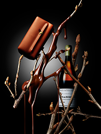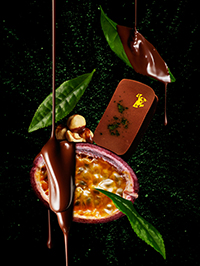 2017年10月に訪れた仏・ニュイサンジョルジュの町で出会った“カシスの新芽”という素晴らしい素材が創作の始まり。カシス畑で実際にその香りを嗅いだとき、カシスの香りの中にスパイシーさや若葉のような緑の香りを感じ、想像を超えた香りに衝撃を受けました。新芽の香味はペルー・チャンチャマイヨのショコラ・オレ48%と、ペルー・クスコのショコラ・ノワール70%を合わせたガナッシュに閉じ込めて。ボトムに数ミリ敷いたカシスガナッシュはベリー感を引き立てるマダガスカルのショコラ・ノワール64%と、フルーティーで華やかな香りが特長のペルー・ピウラのショコラ・ノワール63%で表現。さらに、カシス農園と栽培地域を共にするロマネ・コンティの「フィーヌ・ド・ブルゴーニュ」を合わせて複雑で奥深い香りと味わいを演出しました。奇跡的なテロワールの繋がりが作品のストーリーに奥行きを持たせています。