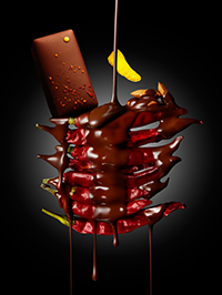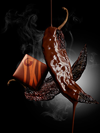 独特な燻製香と、奥深くに甘味を宿したメキシコ産の「チリ・パッシージャ・デ・オアハカ」との出会いが生み出したショコラ。この唐辛子の独特な燻製香を、ガナッシュに使用するフルーティーで華やかな香りが特長のペルー・チャンチャマイヨのショコラ・オレ(カカオ分48%)のクーベルチュールと数週間同居させてじっくりと香りを移し取り、さらに低気圧調理器を使って、辛味や奥深くにある甘味を最大限に引き出しました。さらに、コーティングのペルー産カカオのショコラ・オレ(カカオ分53%)が宿したフルーティーな味わいがより印象深い余韻をもたらします。ひと口目に感じるスモーキーな香り、続いて徐々にやってくる辛味、そして気がつけばチャンチャマイヨのショコラ・オレが辛味と甘味を繋ぎ、最後には心地よいバランスの味わいが口の中に広がっていきます。