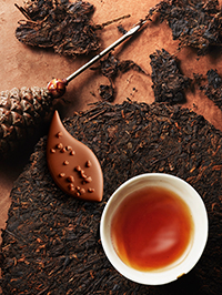春摘みの栄養たっぷりの一番茶が発酵の中盤で凝集して生まれる茶葉の塊(茶頭)。その中でも特に大きなものだけを選別した希少な「大茶頭」を使ったショコラです。発酵の後半、無酸素状態で進む発酵がドライフルーツのような甘味を生み出し、大きな塊は茶葉の体積も大きく、茶頭の中でも優れた香りを持つようになるそうです。特に舌触りもなめらかなコクのある味わいは、フローラルなペルー・チャンチャマイヨ産カカオのショコラ・ブラン40%と素晴らしい相性。さらに、インド・アナマライ産カカオのショコラ・ノワール70%の酸味や渋味がブランデーやドライレーズンのような香りを引き立てて、立体的で深みのある味わいのショコラが完成しました。