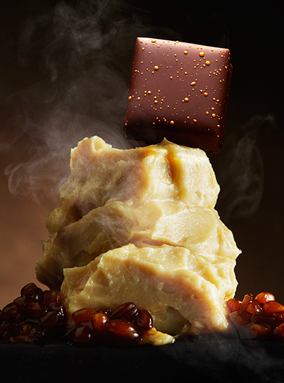大豆発酵食品に以前から注目していたシェフ小山が、満を持して採用したのが「山うにとうふ(豆腐の味噌漬け)」とショコラのマリアージュ。通常の4倍の原料で作られた「堅豆腐」をもろみ味噌に漬け込めば、発酵過程で濃厚な味わいと旨味をまとい、なめらかなチーズのような食感へと変化する。さらにそれを燻製したものを、華やかな香りのエクアドル産アリバナシオナル種カカオのショコラ・オレ(カカオ分50%)と深みをもたらすしっかりとしたカカオを感じるベネズエラ産カカオのショコラ・ノワール(カカオ分72%)と合わせました。スモーキーな香りとともに、豆乳かと思うほどの大豆由来の旨みを凝縮した濃厚な味わいとショコラが生み出す深いマリアージュをお楽しみください。