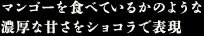 「ブルーベリー」に続いてカカオポッドのスタイルで創り上げた「プログレッシブフルーツ」は、濃厚な甘味と香りを持ち合わせた、夏を代表するトロピカルフルーツ「マンゴー」。シェル(コーティング)の中には、マンゴーパッションのジュレと、自社で独自に創り上げたオリジナルのマンゴーチョコレートのガナッシュを2層にして閉じこめました。パッションフルーツのパンチの効いた華やかな香りと酸味がアクセントとなり、マンゴーの濃厚な甘味とトロピカルな香りがいっそう引き立ちます。シェルにも自家製マンゴーチョコレートを使用。全体のどこをとってもマンゴーをそのまま食べているかのような味わいをお楽しみいただける一粒です。
