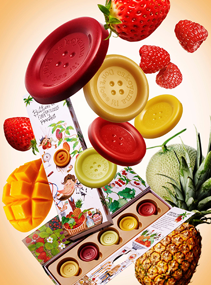 そこで博士は”ボタン”のフルーツチョコレートを開発することにしました。そのカタチには「ボタンが服としっかり繋がっているように僕も生産者さんとしっかり繋がって、みんなが大喜びするチョコレートを創りつづけよう」という決心が込められています。