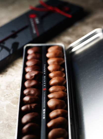 チョコレートをたっぷり纏った、大粒の丹波産黒豆のグラッセ。ミルクチョコレートの最高峰との誉れ高いカカオ分40%のショコラオレと、ほのかな酸味と苦味が特徴のカカオ分56%のショコラノワールをブレンドしたチョコレートが、ほっくりとした丹波黒特有の味わいを引き立てます。粋な黒のパッケージ、整然と並んだショコラの直線的なラインが醸す、"詫び・寂び"の空気感は、和の発想から捉えた、メイド・イン・ジャパンのショコラにふさわしい装いです。