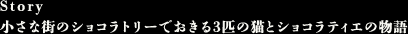 猫の舌のような形をした薄い小さなチョコレートの中に、それぞれ「キャラメル」「プラリネノワゼット」「プラリネアマンド」という3種類のフィリングを詰めました。薄いチョコを割ればトロリと流れ出てきそうなキャラメルや芳ばしいヘーゼルナッツとアーモンドのプラリネとチョコレートのマリアージュは、食べだすとついつい止まらなくなりそうな味わいです。そして、「猫」にちなんでこの3つの味を、いたずら好きな3匹の猫のキャラクターに見立ててオリジナルストーリーを創作。フランスの小さな街にあるショコラトリーを舞台にキャラメル、ノワゼット、アマンドの3匹の猫がいたずら三昧の日々を過ごしながらチョコやナッツの美味しさに目覚め、ついには自分たちでチョコを作ろうと企てる……、そんなストーリーに仕立てました。パッケージにも頭の中がチョコでいっぱいの猫の姿を描いています。物語と共にチョコレートをお楽しみください。