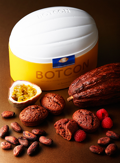 「ボッコン!」という言葉の響きがシェフ小山のアンテナにビビビッときた瞬間、「こんなキャッチーな名前の焼き菓子があったら面白い」「そんなお菓子はこんな箱に入っていたらきっと可愛いだろうな」とイメージがどんどん膨らみ、シェフ小山ならではの感性が導き出した発想とテクニックが詰まった小さなチョコレートの焼き菓子が誕生しました。このお菓子の正しい表記は「BOTCON」。音の響きとフォントのイメージを合わせて考え、普通は「C」が2つ入るところを敢えて1つを「T」に置き換えて、名前もオリジナリティ溢れたものになりました。一つ一つはコロンとした可愛らしいフォルム。ひと口で食べられるベビーカステラのようなサイズ感も、小さくても満足感があるような濃さを表現するための大事な要素です。そんなお味はフランボワーズとパッションフルーツの2種類をご用意。どちらもチョコレートがベースで、メインに使用したのは、カカオハンター®の小方真弓さんが特別に仕上げてくださったコロンビア産カカオのビターチョコレート(カカオ分65%)。フランボワーズにはマダガスカル産カカオを合わせて甘酸っぱさと華やかな香りを引き立て、パッションには隠し味にミルクチョコレートを加えてパンチの効いた酸味と香りをやさしくまとめ上げました。外はサックリ中はしっとりの食感は、焼き上げる最後の火加減の微調整に職人の技が光ります。白と黄色の可愛いパッケージデザインと共に、お子様にもぜひお召し上がりいただきたいやさしいお味のチョコレート菓子です。