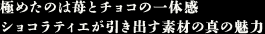 偶然出会った小粒の苺。果実は真っ赤に染まり、酸味が立っていて、苺らしい香りもあって……。こちらのフリーズドライをいただいたときに、「この味と形なら、新しい苺チョコが創作できる」とすぐに確信。フリーズドライの苺に2層のチョコレートをコーティングする技法で素材の魅力を引き出しました。内側は酸味をまろやかにして、コクを生み出すジャンドゥージャ。外側には、オリジナルで配合した苺ミルクチョコレートをかけてチョコレートとの一体感をより引き出しました。奥行きのある味わいに仕上がった“ダブルコーティング苺チョコ”をぜひご堪能ください。