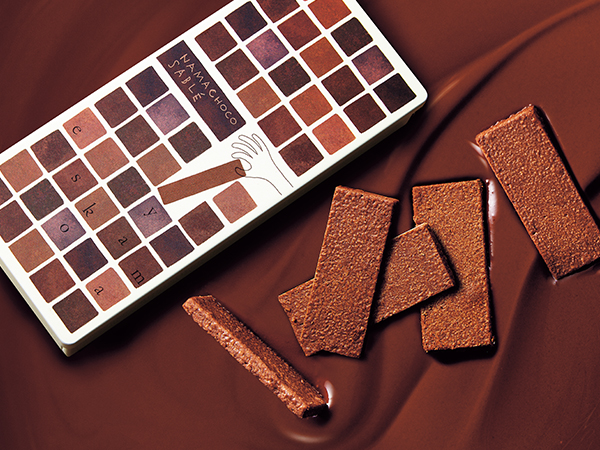 それはたしかにチョコレートを使ったサブレでありながら、俗にいう“チョコレートサブレ”ではない…お口に含むと舌のうえでじんわり馴染んでいくような、体温で溶けていくような感覚は、そう、まるで生チョコレートのよう。材料は至ってシンプルで、セミスイートチョコレート、バター、薄力粉のみ。「いかに生チョコらしい口どけに焼き上がるか」を追求し、緻密な試作を重ねました。そうして導かれた絶妙な配合で混ぜ合わせていざオーブンへ。僅か4分で焼き上げます。あたたかなタッチで描かれた蓋を開ければ、たちまち漂うカカオの芳醇な香りにうっとりさせられることでしょう。焼き菓子であり、チョコレート菓子である、2つのカテゴリーの要素を持つ「生チョコサブレ」をお楽しみください。