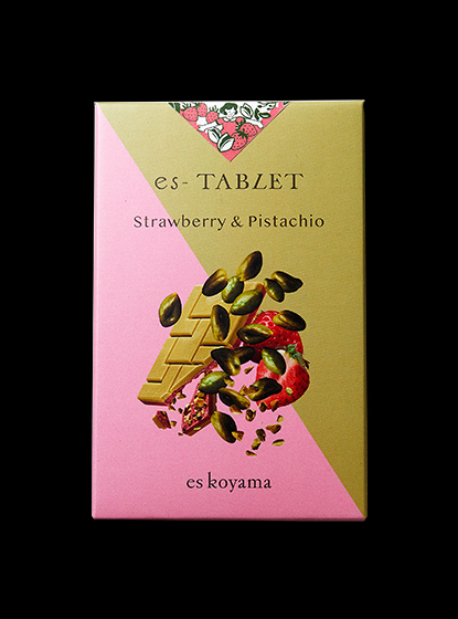 es-TABLETシリーズのファンの方の間では、「今年はどんな形で表現されるのだろう?」と噂になっているかもしれない、「苺」と「ピスタチオ」の組み合わせ。今年は、ピスタチオをメインに、苺とのマリアージュを表現しました。ピスタチオを極限まで練りこんだホワイトチョコレートと自家製の苺チョコレートを重ね、仕上げにはシシリー産のピスタチオダイスを散りばめて。カリカリッと噛んで広がる味わいと、溶けて広がるクリーミーなピスタチオの味わいのコントラストと香りが苺の甘酸っぱさとマリアージュを生み出します。