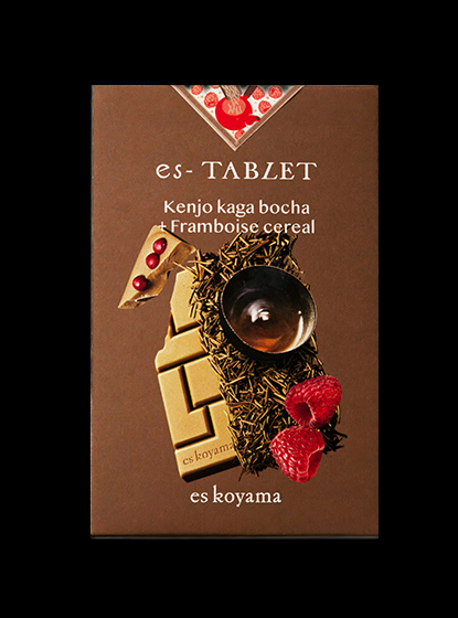 SUSUMU KOYAMA’S CHOCOLOGY 2023のNo.4「献上加賀棒茶×フランボワーズ」をes-TABLETでアレンジ。献上加賀棒茶とは“茎”ほうじ茶のことで、葉よりも香り成分を豊富に含んでいます。主は香ばしいと表現されるピラジン類ですが、スズランのような「リナロール」、ローズを思わせる「ゲラニオール」も潜在。その個性を拾うように、華やかな酸味を持つバラ科のフルーツとコーディネートして垢抜けたお洒落な味わいへと仕上げました。さらに今回は木苺を“シリアル”としてあしらうことで、見た目はPOPに、サクッと音を立てる食感の楽しさも演出しています。