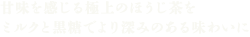 日本の緑茶の一種であり、強火で焙じられた「ほうじ茶」。その香ばしい薫りに ミルクをたっぷり注ぐイメージで、”ほうじ茶ラテ”を表現しました。 鹿児島県で摘まれた上質な茶葉を特殊な方法でムラ無く焙じることで、その旨味 を”甘味”に感じるほどに引き出して。 ベースは乳味感あふれるホワイトチョコレート。通常はカカオバターに乳と砂糖 を合わせて作られますが、砂糖の部分を”黒糖”に置き換えることで深みのあるコ クをプラス。 チョコレートのまろやかな口どけとともにほうじ茶の余韻が心地よく持続する、 シンプルながら飽きの来ない一枚です。