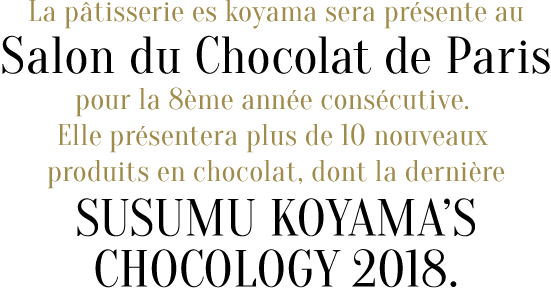 La pâtisserie es koyama (ville de Sanda, préfecture de Hyogo, Propriétaire / Pâtissier : Susumu Koyama) participera au Salon du Chocolat de Paris, le plus grand événement mondial du chocolat, qui se tiendra dans la capitale à partir du mercredi 31 octobre 2018. Elle présentera et proposera à la vente les tout derniers nés de ses chocolats, la SUSUMU KOYAMA'S CHOCOLOGY 2018, ainsi que plus de 10 nouveaux produits en chocolat que le public aura le privilège de découvrir en avant-première.