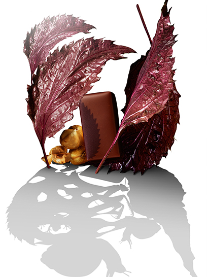 日本に古くからあるハーブの一種で、昔から「生薬」としても用いられてきた「紫蘇」。その中でもアントシアニンを豊富に含み、爽やかでふくらみのある香りを持つ和歌山県産の「赤紫蘇」を、ふくよかな香りと味わいを持つピエモンテ産ヘーゼルナッツの自家製プラリネと合わせました。今回プラリネに混ぜ込んだ赤紫蘇は、パウダーにしてそのまま混ぜ込むだけではなく、酸と反応させることで落ち着いた中に“力強さ”も感じる深い味わいの表現ができました。濃厚なイメージのあるプラリネが、赤紫蘇によってエレガントに生まれ変わる・・・・・・。花のような香りすらイメージさせてくれる華やかな新しいプラリネの誕生です。さらに、エスコヤマの数種類あるレシピの中から選んだ、ペルー産カカオのフルーティーな酸味を宿したショコラ・オレ(カカオ分53%)のコーティングが、いっそう赤紫蘇の風味を引き立てます。全体の中でも落ち着いた和の風情を感じる味わいは、No.1からNo.3のショコラへと繋ぐための布石。少し心を落ち着かせ、味わいの変化が描く曲線がNo.3でグンと跳ね上がってほしい・・・・・・そんな思いを込めた一品です。
