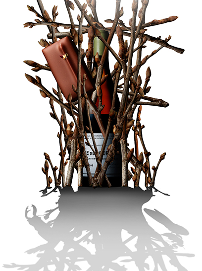 4つの作品を一つの交響曲に例えるなら、“主題”に当たる作品が「No.3 カシスの新芽&ロマネ・コンティ(フィーヌ・ド・ブルゴーニュ)」だ。カシスという植物が一番輝いているのは、果実が実り、熟して美味しくなったときだ、と言う人が多いだろう。昨年の10月に訪問したニュイサンジョルジュのカシス農園でその思い込みは大きく覆された。農園で「これ、指で潰して嗅いでみて」と言われて嗅いだのが「カシスの新芽」。その香りは、カシスの香り、若葉のような緑の香りの中にスパイシーさもあり、とても魅力的だった。実は、ここに来る前日にディナーで入ったレストランで、ある料理にコショウのような使われ方をしていたのが、この素晴らしいポテンシャルを持つカシスの新芽を乾燥させてパウダーにした「ポワブル・カシス(カシスのコショウ)」だった。出会った時点ですでに興味が湧いていたが、農園で実際に生の香りを体験し「この香りをショコラで表現したら、きっと素晴らしい作品ができるだろう」と確信した。このNo.3のショコラには、カシスの新芽がメインの素材であり、フルーティーさを引き出すカシスの果汁も入っている。さらに、これに合わせたのは、カシス農園から車で5分ほどの距離にあるという「ロマネ・コンティ」のフィーヌ。最後はテロワールに導かれ、このNo.3は完成した。