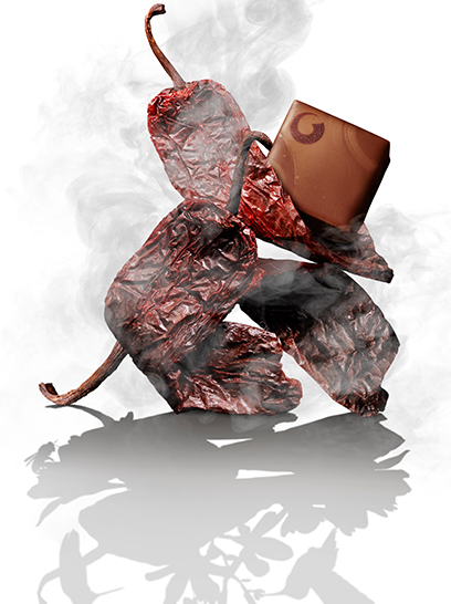 あるとき、唐辛子の専門家からいただいた数種類の唐辛子の中に入っていた、メキシコ産の「チリ・パッシージャ・デ・オアハカ」。その香りはどれよりもスモーキーで奥行きを感じるものでした。完熟して真っ赤になってから人の手によって丁寧に摘み取られた唐辛子は、一部ではフレッシュなまま市場に出回りますが、その多くは保存のために乾燥させます。ただ、地域的に湿度が高いため、伝統的に煙を使って乾燥させます。そのときに付くこの燻製香が、オアハカの最大の特長です。また、完熟した唐辛子は辛味の中にフルーティーな甘味を宿しており、この特長に惚れこんだ私は「唐辛子らしい辛さよりも、この独特の燻製香をショコラに宿らせたい」と思い、すぐに試作を開始。その中で、単にアンフュゼするだけではポテンシャルを最大限に活かすことができないことがわかり、ガナッシュに使用するフルーティーで華やかな香りが特長のペルー・チャンチャマイヨ産のショコラ・オレ(カカオ分48%)のクーベルチュールと数週間同居させる、という古典的な手法でじっくりと時間をかけてオアハカの最大の特徴である燻製香を移し取りました。さらに、低気圧調理器も使って生クリームにアンフュゼし、ポテンシャルを最大限に引き出しました。仕上げにほどこしたコーティングのペルー産カカオのショコラ・オレ(カカオ分53%)が宿したフルーティーな味わいがより印象深い余韻をもたらします。辛味のバランスをどう出すか、という調整に苦心しつつ、その特長を活かすペルー産カカオとのマリアージュによって、独特の燻製香とフルーティーな甘味、そして最後にやってくる心地よい刺激が深い味わいを生み出す一粒が完成しました。4種類のショコラを締め括る作品でありながら、この一粒を味わった後にNo.1に返って味わうと、円を描くように広がるNo.4の刺激の真ん中からNo.1のオレンジ色の菊の花がパッと開いていくような光景が脳裏に浮かび、皆さんを再び「Wonderful World」へといざなってくれることでしょう。