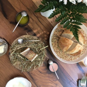 6品目は、先程写真でもご紹介した、焼き方を調節することができるグリルを使用し、炭火の遠火でじっくりと温めたパンに牛の骨髄を炙ったもの・オリーブオイルを固めたもの・バターの三種類を塗って食べるひと品です。牛の骨髄は海外では定番もので、小山シェフも「美味しい料理を作る料理人たちの間ではよく知られているメジャーな食べ物で、実際とても美味しいものだ」とおっしゃっておられましたが、私にとっては初挑戦。ブーダンノワールはあくまでも「ソーセージの一種」と考えることができたのですが、この骨髄はどんなジャンルとして捉えればよいのかまったく想像がつきませんでした。こちらも恐る恐る食べてみたところ、プルプルとしたゼリーのような食感と濃厚で、外はパリパリ、中はモッチリとしたパンを美味しくさせてくれました。オリーブオイルやバターを塗っても美味しいのですが、骨髄は格別に美味しかったです。