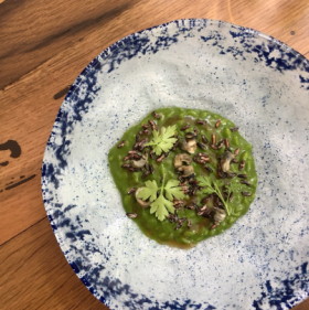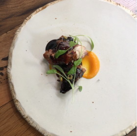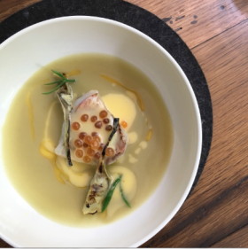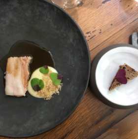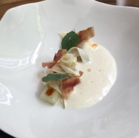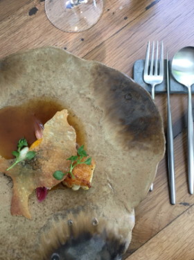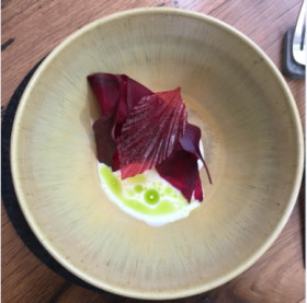 2品目は、炭火で焼いた鯖の上に薄く切ったビーツ。葉っぱの形をしたチュイールが乗っており、その周囲に生クリームとチャービルのオイルが敷かれている料理でした。私は今まで、ビーツを野菜ジュースでしか味わった事がないので、初めてこの日ビーツそのものを味わうことができました。炭火の香りがついた鯖と少し歯ごたえがあるビーツ、チュイールの甘み、またチャービルのオイルの香りが重なり合い、香り、食感と、とても美味しくいただきました。