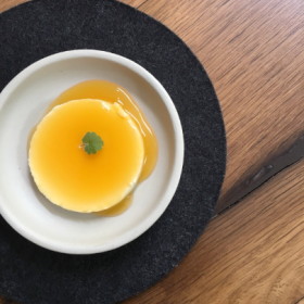 9品目は、羊のチーズケーキでした。かけられていた周りのソースが小山シェフも「何やろ?」とおっしゃっていたのですが誰もわからず、色だけで見ればマンゴー?パッション?など色々なものを考えましたが、食べてみると酸味などはなく、ほんのりとした甘みがありました。結局、店員さんに確認したところ、「さつまいものソース」でした。チーズは羊特有の香りがあるものの、癖がなく、濃厚な味わいでした。