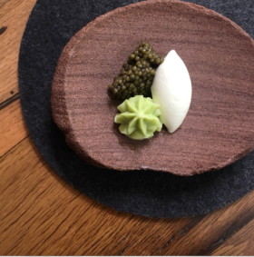 10品目は、ミルクアイスにイタリアンキャビアとアボガドのクリームを付け合わせたもので、ミルクの甘みにキャビアの塩味、アボガドの濃厚さが絶妙でとても美味しかったです。先程のチーズケーキの濃厚な味わいとは反対に、塩味も感じることができるこのデザートはあっさりしていて、すぐに食べ終わってしまいました。