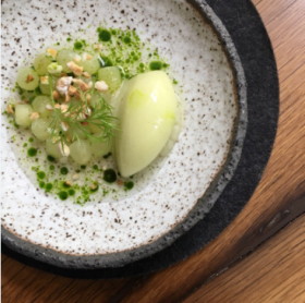 11品目は、リンゴのアイスとリンゴの果肉にアーモンドのソースとフェンネルのソースをかけたもので、先程よりもいっそうさっぱりした味でリンゴの瑞々しさとフェンネルの香りがとても相性がよく、またアーモンドの食感や味がアクセントになっていて、美味しかったです。