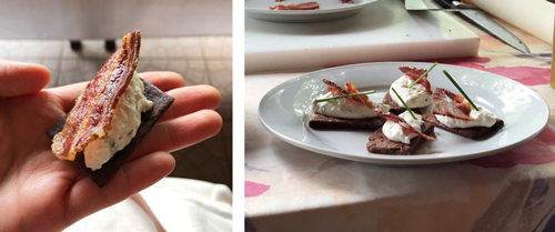 タロという薄いパンの上に、時間をかけて水切りをした羊乳のチーズにスパイスを加えたものと、十分に乾燥させることで、香りをよく引き出したベーコンと一緒にいただきます。ベーコンの塩味と羊乳のクリーミーな風味を感じる日本では味わえない一品でした。