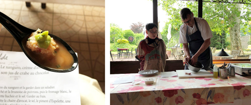 カニ汁とチョコレートを混ぜて煮詰めたソースに、カニのほぐし身、香味野菜、スパイス、アヴォカドを使用した冷たい料理です。