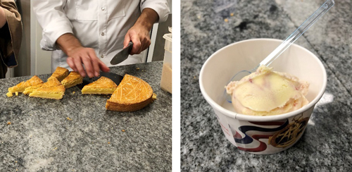 厨房の見学途中、マネスという羊乳で作られたアイスとガトーバスクを振舞って頂きました。ガトーバスクについては、平日100台、土日ですと150台も作るそうです!
