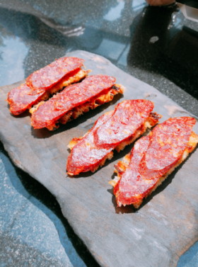 こちらはトーストしたバケットの上にチョリソー(辛みのあるソーセージ)を乗せたものです。チョリソーも辛すぎず、カリッとしたバケットの食感がとてもよかったです。