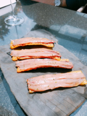 アンチョビが丸ごと乗った前菜です。一口食べるとバリっと音がし、なんだろうとよく噛んでいるとポテトの味がしました。アンチョビのほど良い塩味が、ポテトの風味と重なり、すごくおいしかったです。パンでもこの組み合わせは使えるなと感じました。