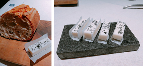バターとともにバケットが運ばれてきました。バターと言っても普通のよりも真っ白な色をしており、これはヤギのミルクで作られたバターでした。常温で柔らかくなるほどのなめらかさで、口の中でスッととけます。コクのある風味と塩気が絶妙で、料理が来る前にパクパク食べていると、シェフは「バケットは薪焼きでリベイクしたほうがもっとおいしくなるのでは」とおっしゃっていました。
