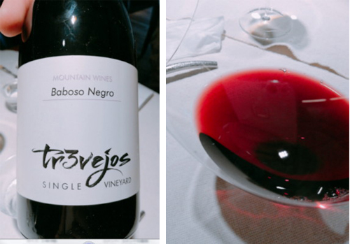 そして料理も中盤に入り、赤ワインを頂きました。研修旅行2日目に習った赤ワインのテイスティングを早速実践してみました。赤ワインは背景が白くなっているところに少し傾け色をチェックします。このワインは、少し赤みがかった赤なので熟成されたブドウで造られており、もし紫のような赤だと若いブドウで造られたということになります。ちなみに白ワインは光にかざし色のチェックをしますので、みなさんもぜひ試してみてください。